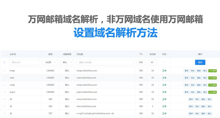 当您购买了万网企业邮箱产品之后,除了需要对邮箱进行设置之外,最重要的是需要对邮箱所绑定的域名进行域名解析,添加对应的解析记录并生效后,企业邮箱才能够正常的收发邮件。