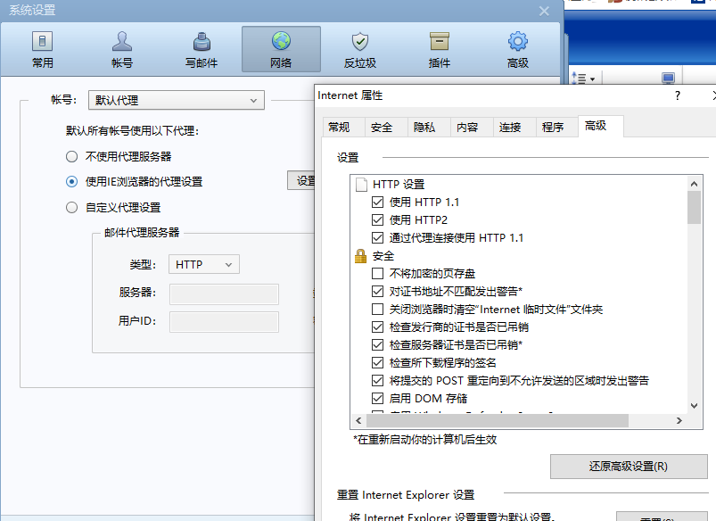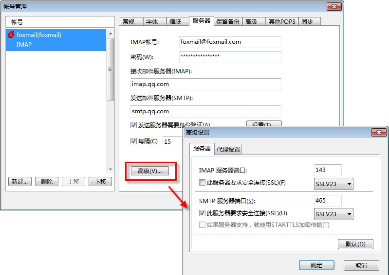 3. 进入 设置 - 帐号 – 高级,检查服务器、端口和SSL安全连接是否正确设置