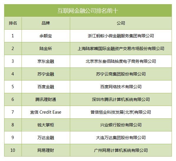 中国报告大厅公布了《互联网金融公司排名》的数据统计,其中,排名前十的分别是余额宝、陆金所、京东金融、苏宁金融、百度金融、腾讯理财通、宜信、钱大掌柜、万达金融和网易理财。