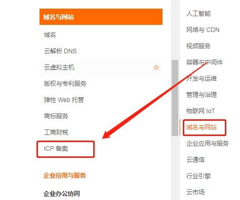 2、在右则有个域名与网站,找到icp备案.也可以在搜索那里直接索icp备案.