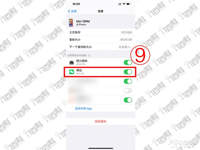 5、找到【微信】,将后面的开关开启即可实现自动备份,一旦误删APP或更换手机都可以通过iCloud恢复APP及数据。