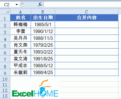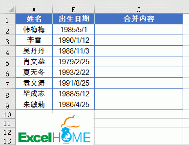 合并带有格式的内容时,Excel默认按常规格式进行合并,但是如果是日期、时间或是其他有格式的数值,结果就会让人大失所望了: