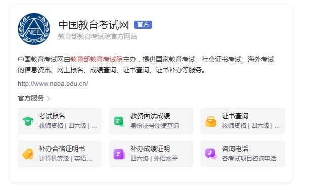 中国教育考试网由教育部教育考试院主办,提供国家教育考试、社会证书考试、海外考试的信息资讯、网上报名、成绩查询、证书查询、证书补办等服务。