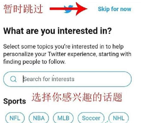 第九步:最后选择你感兴趣的话题,也可以点击“SKip for now”暂时跳过,这样我们的推特账号就注册成功了。