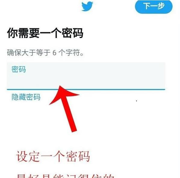第六步:最后需要我们设置推特密码,大家设置好后一定要记住密码,因为没有第二次验证的机会。