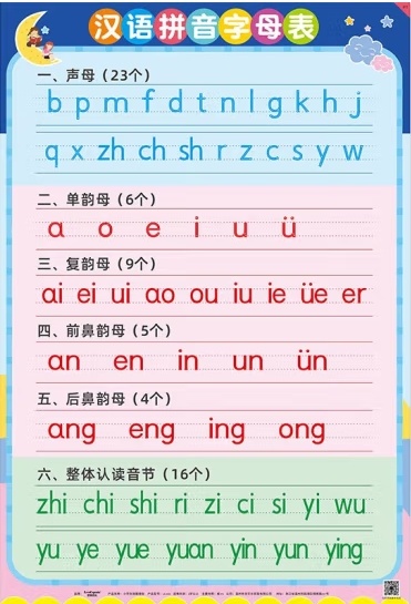 a、o、e、i、u、ü、ai 、ei、 ui 、ao、 ou、 iu 、ie 、üe、 er、 an 、en 、in、 un 、ün 、ang 、eng、 ing 、ong。