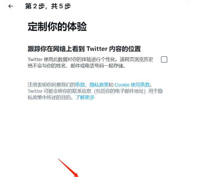3、根据您的喜好选择推特跟踪您的电子足迹以便指定个性化内容,然后点击【下一步】;