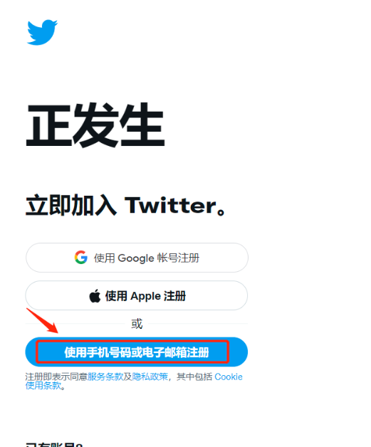 1、首先,我们在谷歌浏览器打开推特官网:https://twitter.com/?lang=cn,然后点击【使用手机号码或电子邮箱注册】;