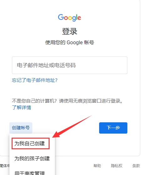 1,访问 Google 账号页面(https://accounts.google.com/),这里直接选择创建账号,下拉框中选择“为我自己创建”,然后点击下一步。