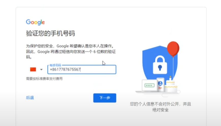 4,验证手机号码,地区要选择中国,也要填自己的手机号码,点击下一步