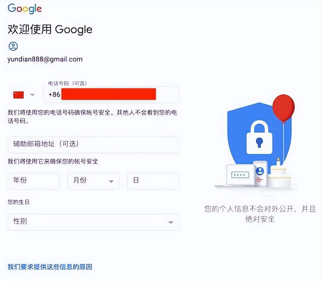 5,验证好手机后会出来一个安全邮箱及生日建议填写18岁以上,点击下一步