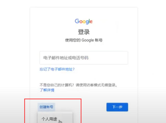 2,页面会跳转到登陆账号,点击创建账号选择个人用途