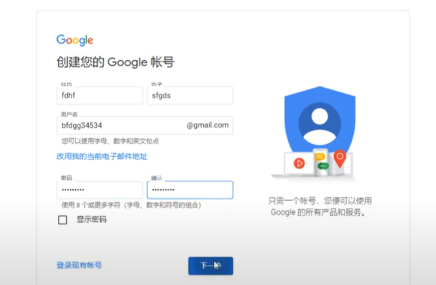 3,下一步是资料的填写界面,邮箱尽量用gmail邮箱,用户名和密码要记住,填好下一步