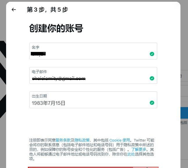 2、现在填写名字,邮箱(真实可用能接收验证码的邮箱,建议大家使用Gmail邮箱),出生年月日,然后点击”下一步“。