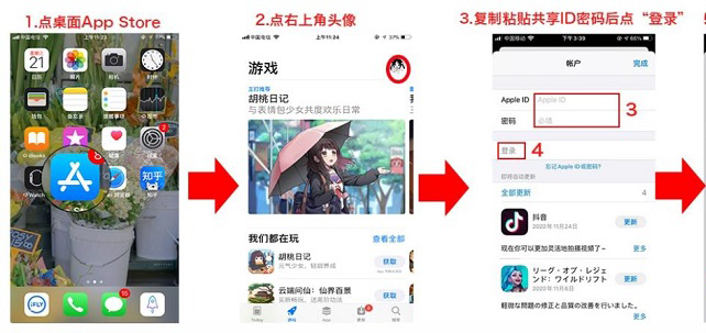 打开苹果手机AppStore应用商城——退出我们当前所登录的苹果id账号——复制粘贴以上的共享账号密码进行登录——选择“其他选项”和“不升级”;