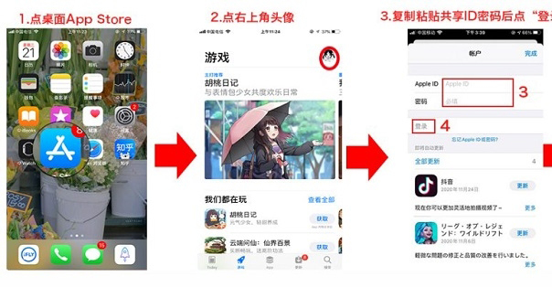 首先,打开手机App store苹果应用商店,点击右上方的头像,退出当前所登录的账号;然后,复制粘贴共享苹果id账号,点击登录按钮;最后,选择其他选项和不升级,跳过双重认证;