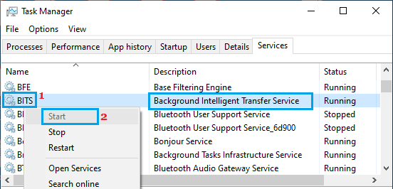 2、在任务管理器界面,选择服务选项卡并确保BITS服务正在运行;