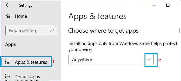 2、在接下来的界面中,点击右窗格中的应用和功能,然后右窗格中点击向下的箭头,并选择任何位置或安装非Microsoft应用程序时发出警告选项。