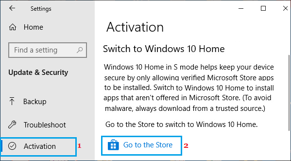 2、接下来的屏幕上点击左窗格中的激活,然后在右窗格中点击【切换Windows10家庭版】或【专业版】部分下的【转到商店】选项;