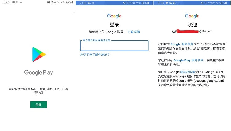 3、安装完成后,谷歌应用商店下载成功了,需要您准备一个谷歌账号来开启谷歌市场(有谷歌账号的直接登录即可,没有账号的朋友可以自行注册,也可以购买一个谷歌账号)。