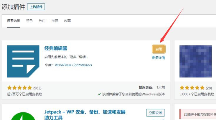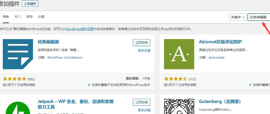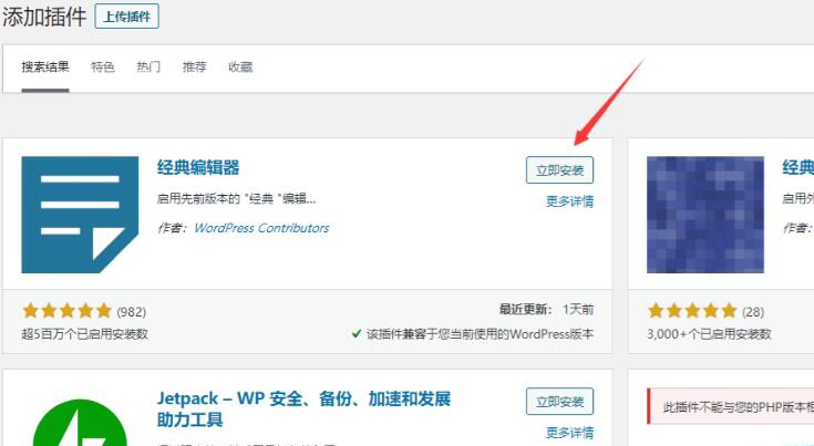 3,在弹出的搜索结果页中,你就可以看得到第一个插件就是经典编辑器,点击立即安装,然后页面上就会显示正在安装。