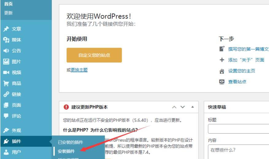 1,依次点击wordpress博客网站后台左下角的:插件→安装插件