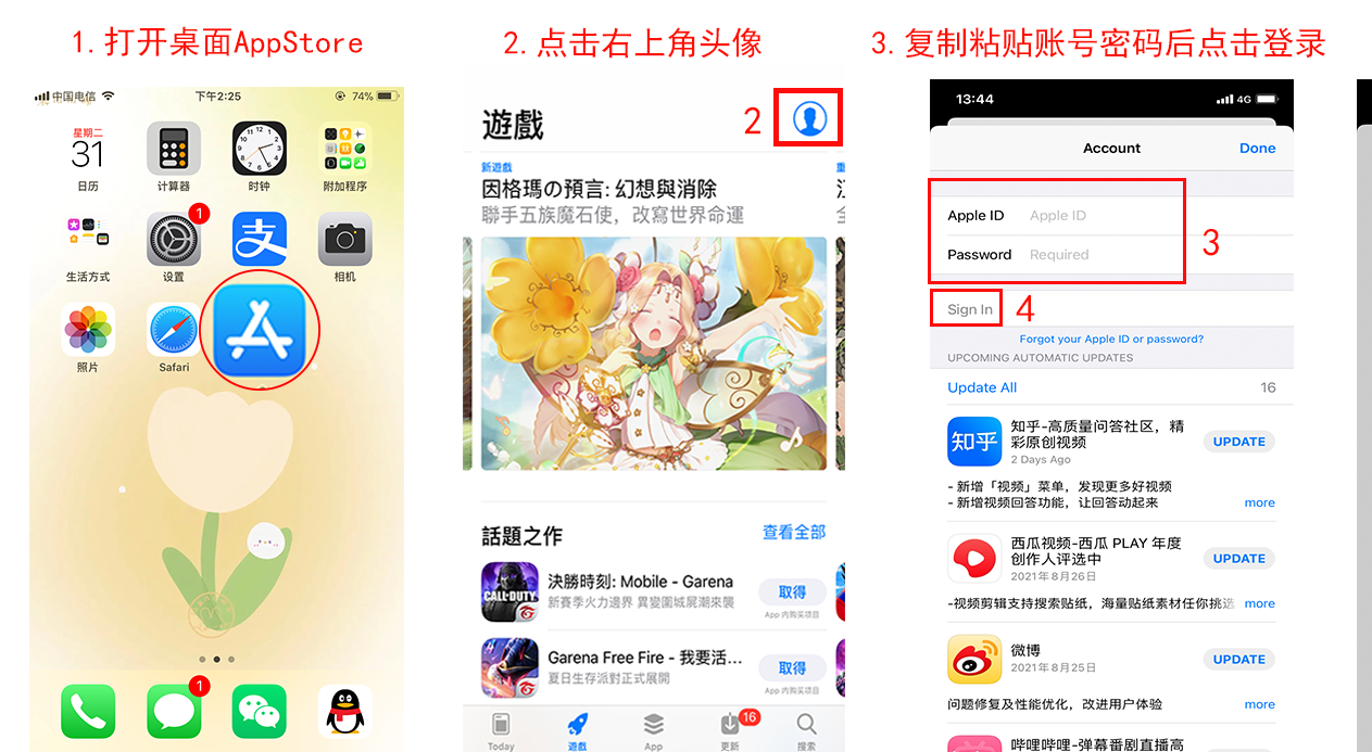 2、再到AppStore里面登录我们准备好的美国苹果ID账号,一定要按下图流程操作。