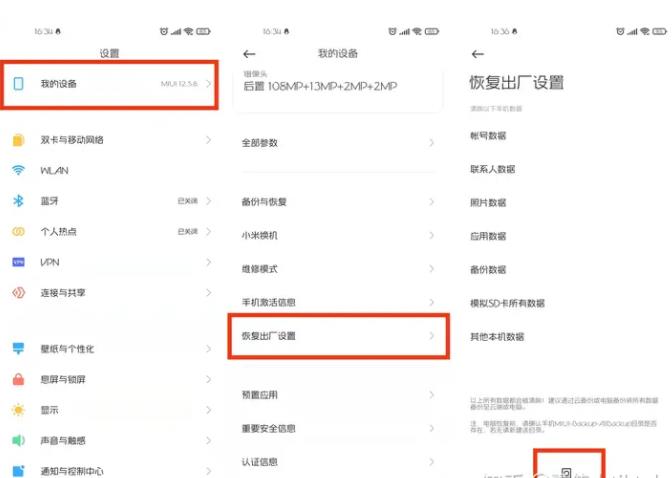 1、首先我们把手机内的SIM卡拔出,在手机设置——我的设备——恢复出厂设置,直接进行手机刷机,刷机后开机的设置过程中可以选择中文,方便后续的操作。
