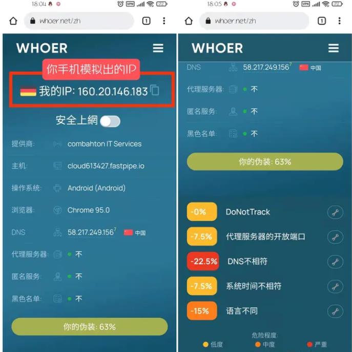 3、手机设置和加速器都配置完后,我们可以使用浏览器打开whoer.net,对手机的状态进行模拟度测试。模拟度测试就是一个非常直观的去检测你的手机现在是否符合了正常使用Tiktok的标准,如下图: