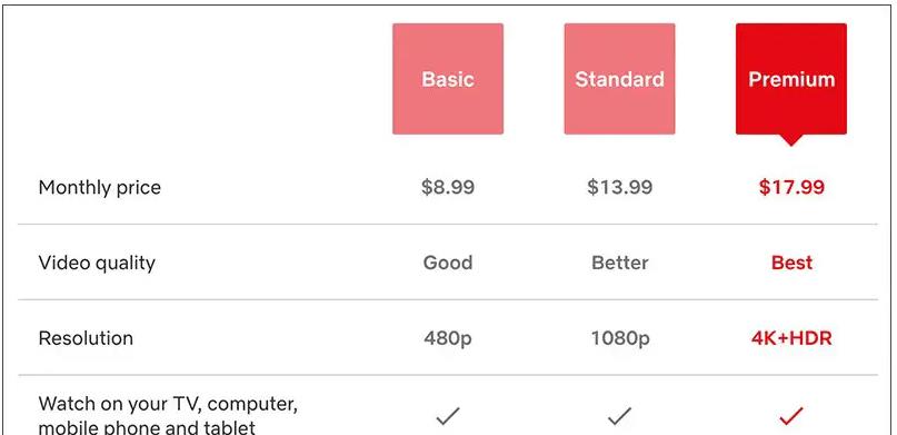 奈飞会员价格是根据您第一次注册IP地址决定的,如果您只用手机观看的话,可以选择较低套餐,要是追求高画质或是多人使用,可以选择高级套餐。如下图美国套餐不同等级收费标准: