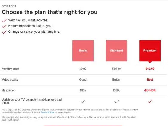 高级套餐(Premium):可以播放4K+HDR超高清视频,可以同时在四台设备上观看。