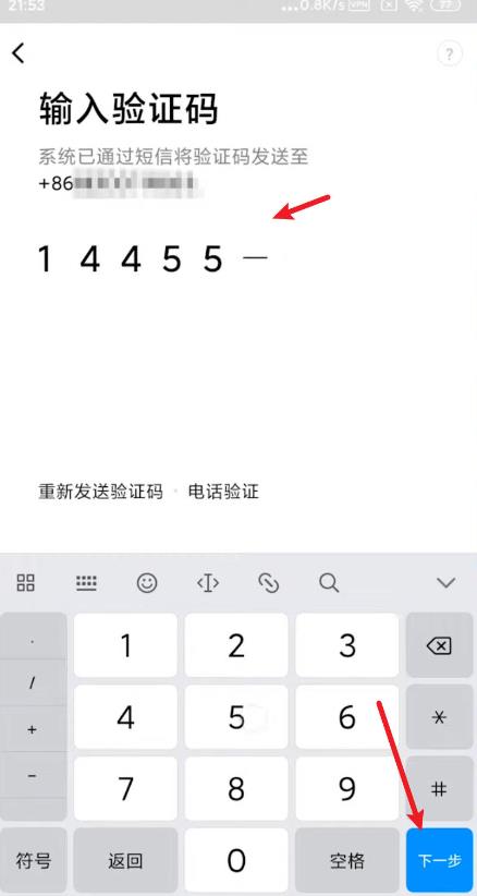 8、点击重新发送验证码,收到后输入验证码,点击下一步;