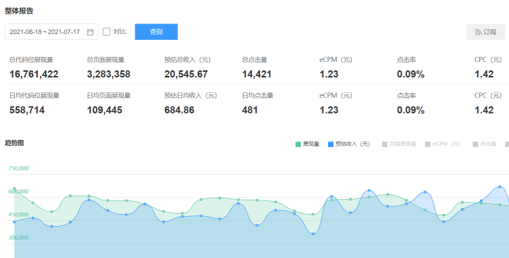 虽然不知道具体的广告数据,但是根据上图可看出6月18到7月17日,一个月总点击量14421个,总收入在205454.67元,平均点击单价1.4元,点击率0.09%,这个数值是比较合理的。