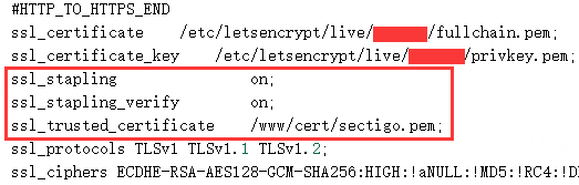 如图加在证书配置处即可,如果是Let’s Encrypt的证书因为不校验证书链无需指定ssl_trusted_certificate,只加前两句即可。
