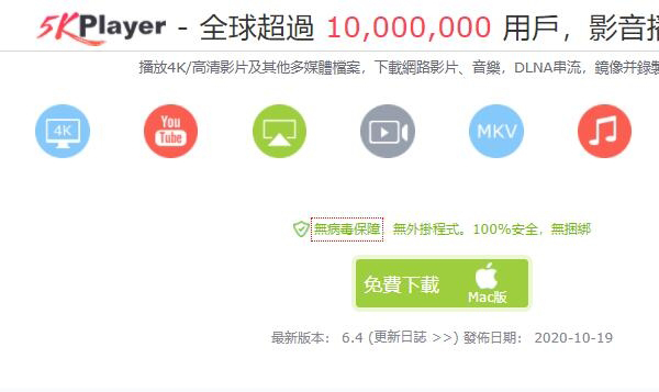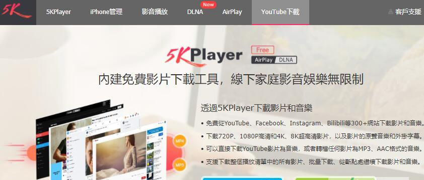【5K Player】是一款完全免费的油管视频下载软件,没有病毒和广告非常的安全,适用于Windows、macOS设备。无需注册就能下载4K高清的油管视频,还能免费在油管、脸书、Instagram、Bilibili视频等300+网站下载影片、歌曲、音乐、直播等。下载的数量没有限制,其功能都是免费使用。