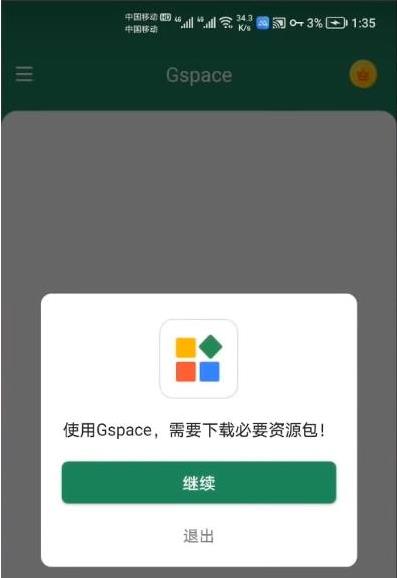 第二步:安装好后打开Gspace,接下来的提示都点击同意即可。当Gspace提示“使用Gspace,需要下载必须资源包”,点击继续,Gspace自动就安装谷歌三件套。