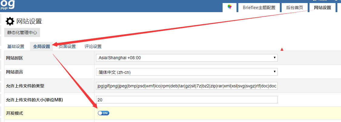 首页打开网站设置,全局设置,然后找到如图开发模式,将其打开(on为开启状态)