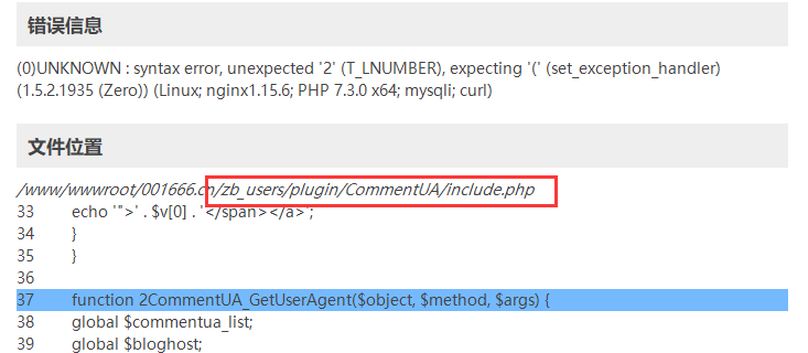 图中的位置/zb_users/plugin/CommentUA/,其中/plugin/是插件的目录,而/CommentUA/是指插件的ID,其实很简单,只要看/zb_user/后面的是不是/plugin/就行,是的话就是插件问题,不是的话基本都是主题导致的错误。只要ID怎么看,别问我,我无能而立,帮不到你了。