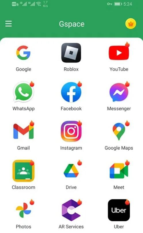 6,INS安装好过后,我们下次怎么进入ins呢?我们打开Gspace,进入主界面,我们可以在主界面看到我们所有安装的APP。图标右上角没有“火”图标的,都是我们已经安装了的软件,有“火”图标的,就还没有安装。在这里,我们就可以看到我们安装的ins,可以直接点击图标进入,和手机桌面上的快捷方式是一个道理。