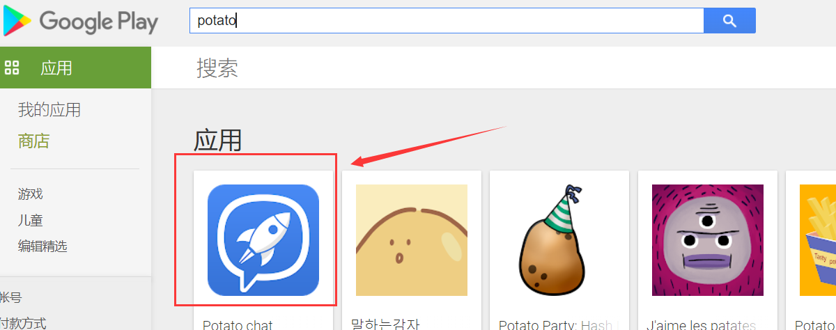 4、这个时候,我们就可以去搜索框里面搜索“potato”了,大家会发现,正版 potato 出来了,点击下载即可成功安装。