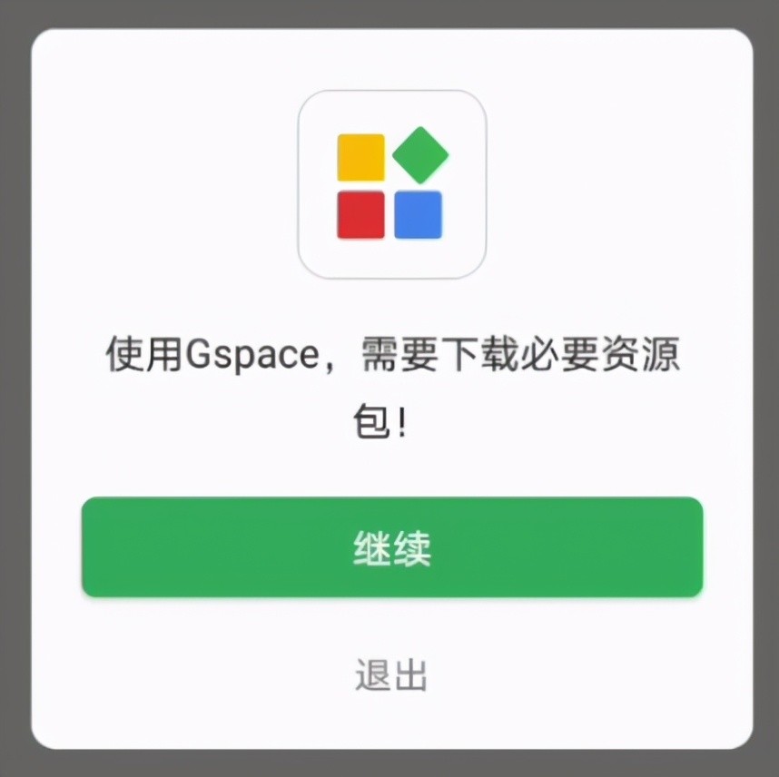2,安装完成后打开Gspace,在Gspace提示我们“使用Gspace,需要下载必须资源包”,我们点击继续。这个时候,Gspace就会自动安装。Gspace的工作原理,相当于是一个GMS的壳程序,让你在该应用内执行任何谷歌应用,因此不会对你的系统造成任何影响。
