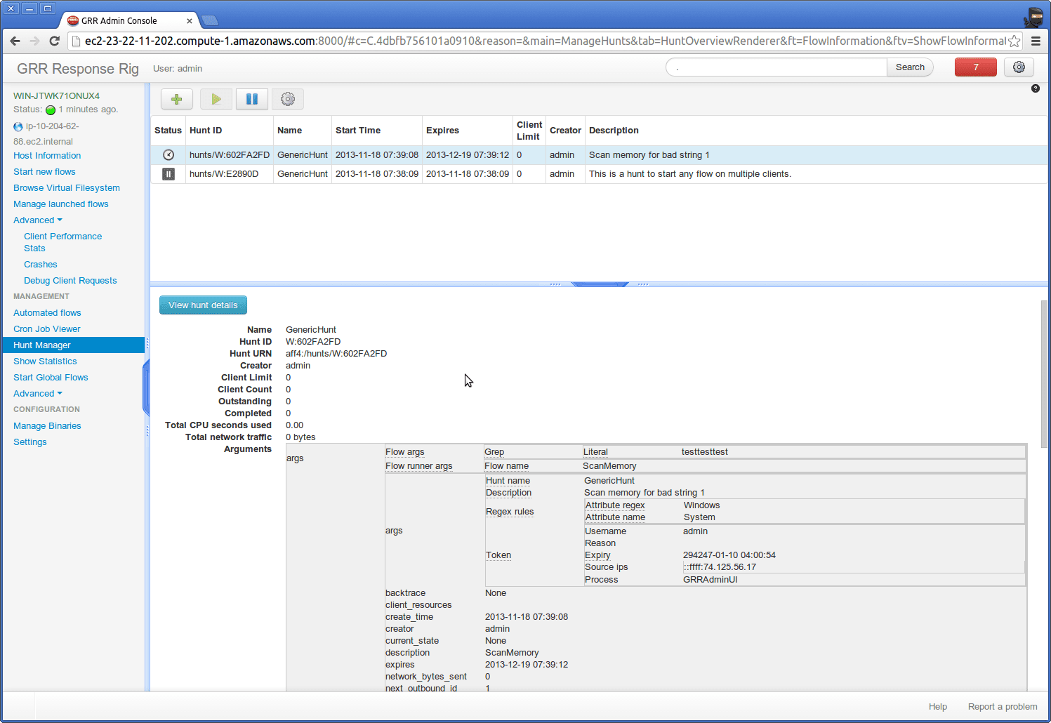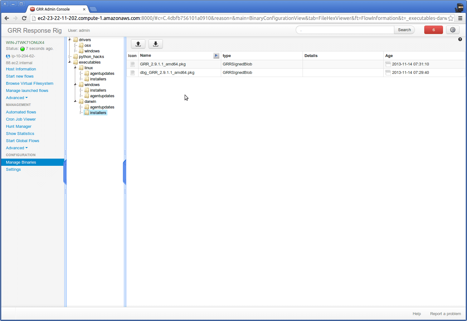 - GRR客户端:部署在可能要调查的系统上。在每个这样的系统上,一旦部署,GRR客户端会定期轮询GRR前端服务器以进行工作。“工作”意味着运行特定操作:下载文件,列出目录等。