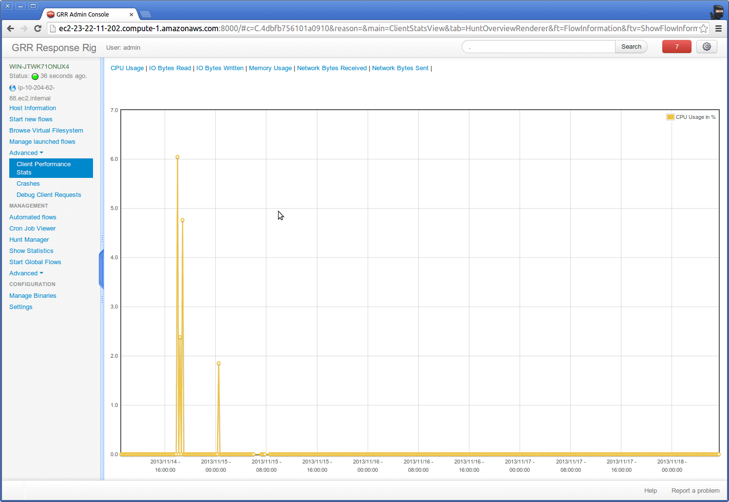 GRR Rapid Response是一种事件响应框架,专注于对Linux、macOS/OS X和Windows客户端远程执行实时取证分析。调查人员将Python代理安装到目标系统上后,可以远程实时分析内存,以便收集用于取证分析的数据证据,并执行详细的系统监控,监控CPU、处理器和输入/输出使用情况。GRR还使用SleuthKit让调查人员可以访问原始文件系统,更底层的进行网络取证工作。