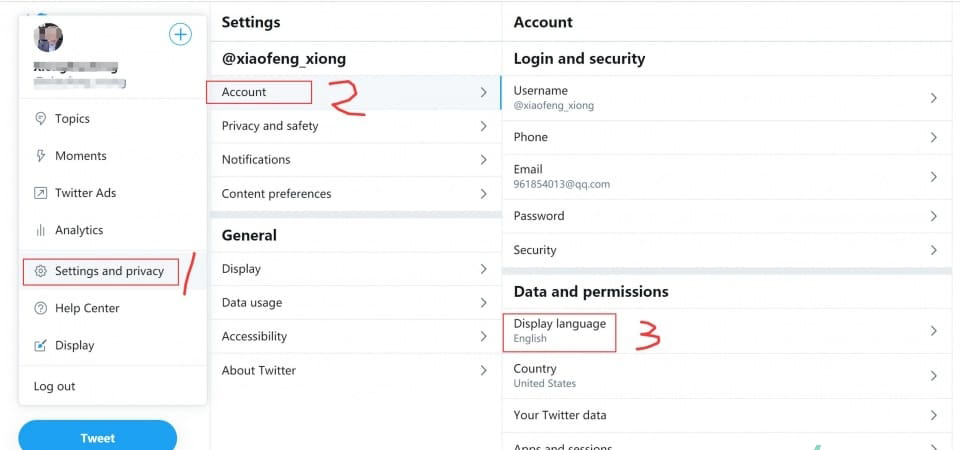 1、点击——Settings and privacy——Account——Display language