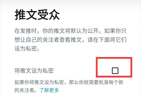 12、推文受众,这里一般不勾选,如果你只是用来记录私密,可以勾选,勾选了任何人都无法查看你的推文了。
