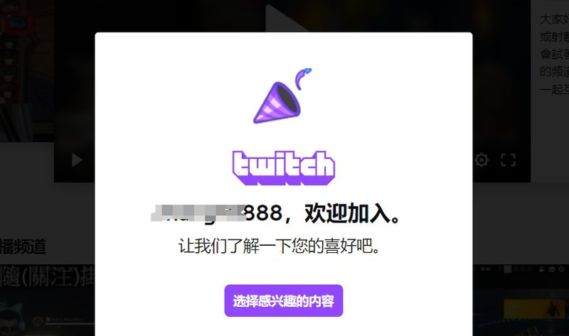 8、账号注册成功,twitch主页会弹出欢迎页面,选择你感兴趣的内容,开始体验吧!