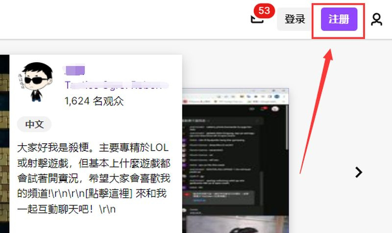 2、打开官网过后,我们点击右上角的注册按钮,为自己注册一个twitch账号,这样才能更好的体验twitch给我们带来的乐趣。