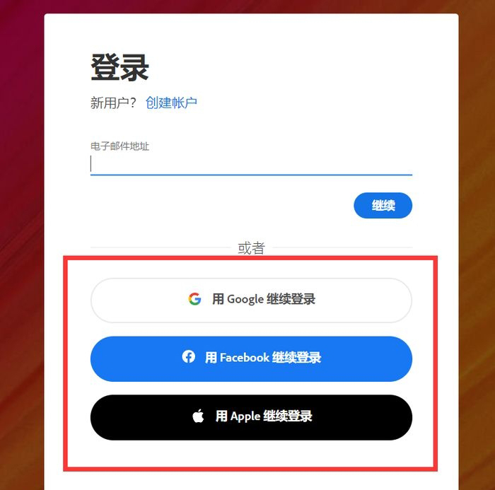 2、进入登陆界面,官方提供给了我们三个可以直接登陆的入口,无需注册。支持谷歌账号、脸书账号、苹果ID直接登陆。