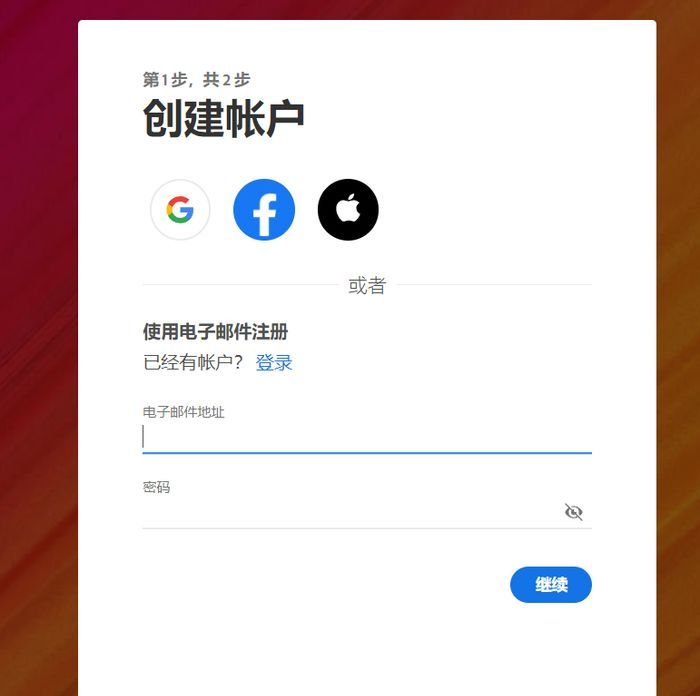 3、如果没有以上账号,我们可以点击注册按钮,进入注册页面。使用一个电子邮箱即可成功注册,注册是非常简单的。