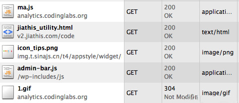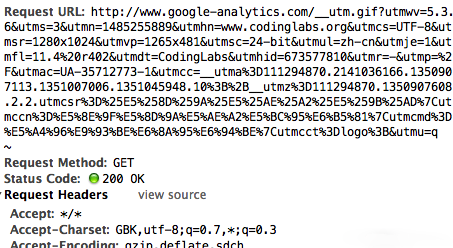 可以看到ga.js在请求__utm.gif时带了很多信息,例如utmsr=1280×1024是屏幕分辨率,utmac=UA-35712773-1是_gaq中解析出的我的GA标识ID等等。